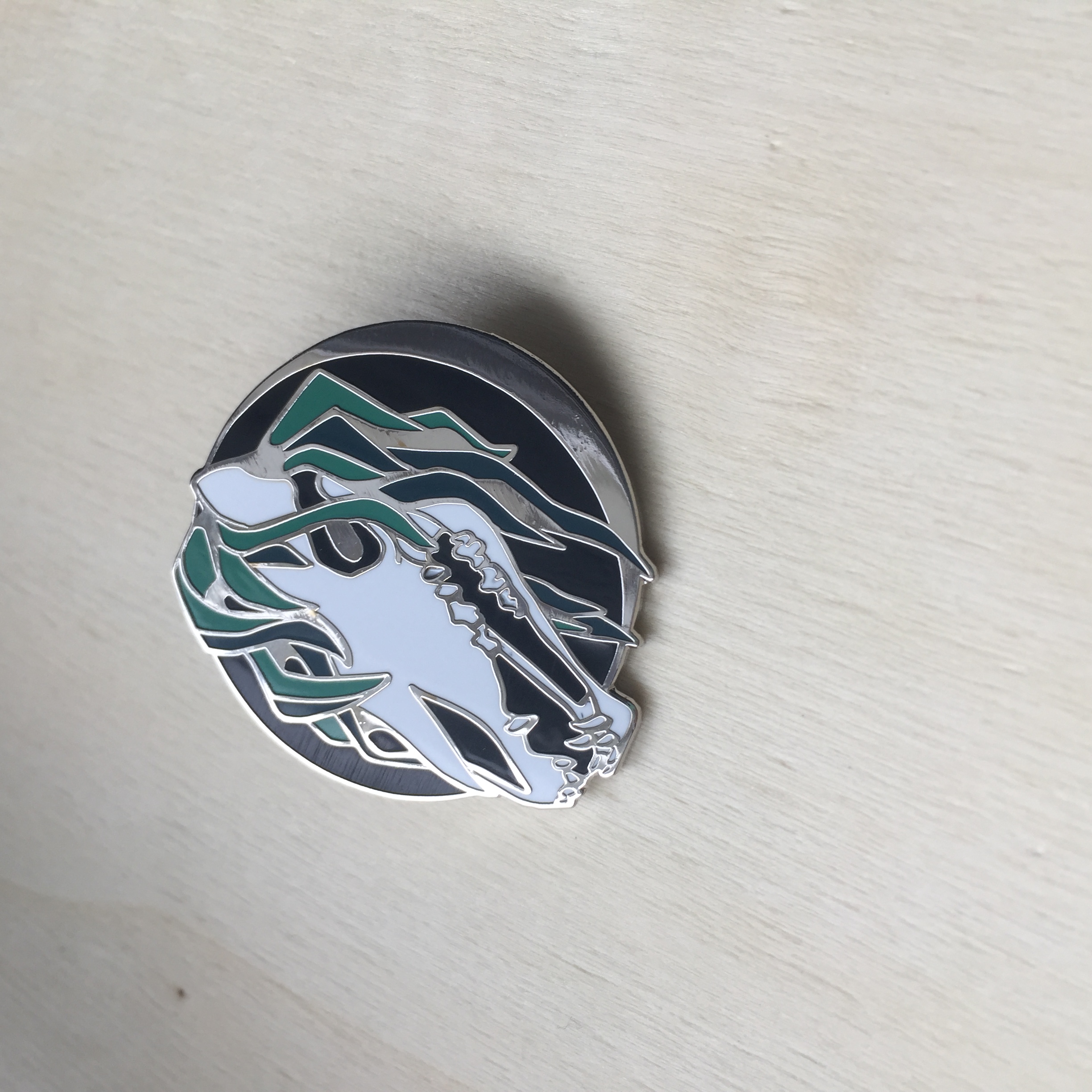 The Kelpie enamel pin is 1.5” with silver plating and comes with a rubber back.